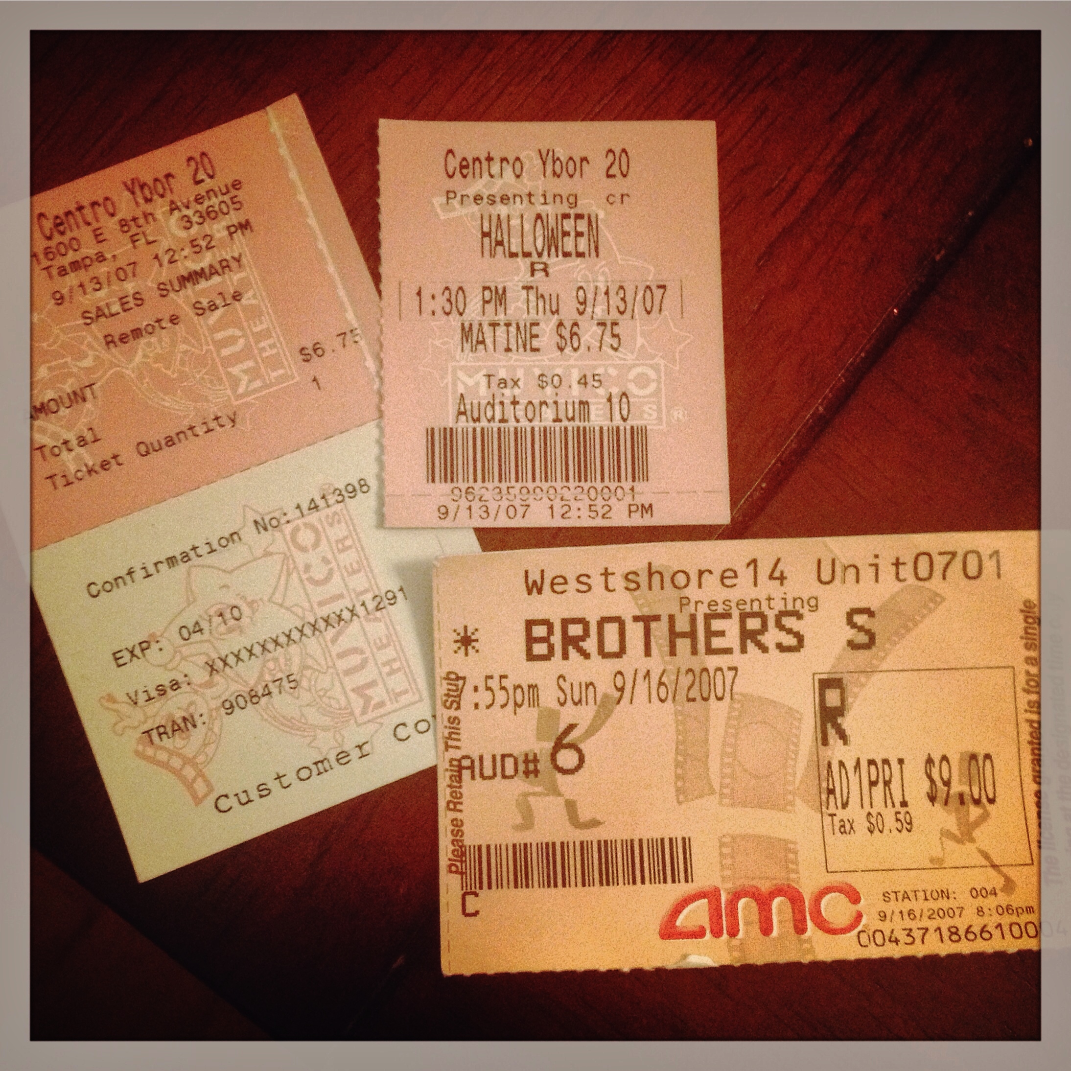 On yet another trip with my friend, this time to Florida in 2007, I saw the remake of Halloween in Ybor Harbor (Tampa) while she worked, then we both laughed our heads off watching Superbad one wet, quiet night in another part of Tampa (weirdly the ticket stub incorrectly says Brothers S?).