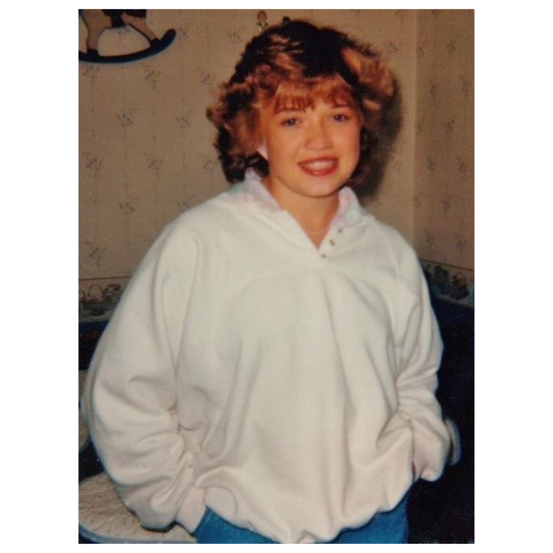 Barely-teenager me, with the dining nook & wallpaper/border behind me. 🙂